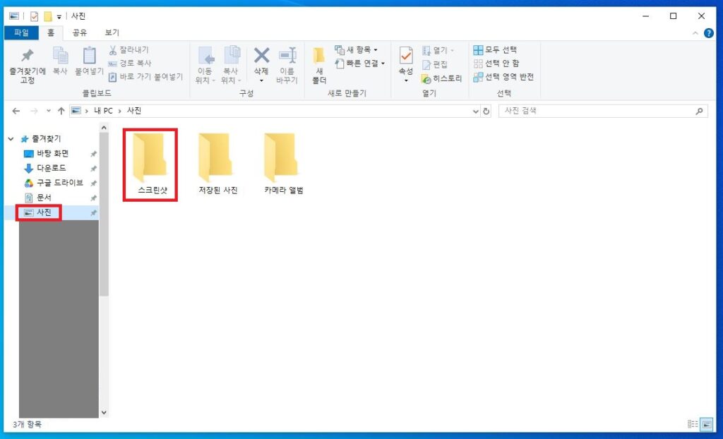 위에 사진 예시처럼, 기본 사진 폴더 안 스크린샷 폴더에 들어가면 자동 저장돼있는 캡처 파일을 볼 수 있습니다. 사진 폴더는 “윈도우 로고 + e” 단축키로 빠르게 접근할 수 있습니다.